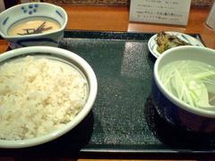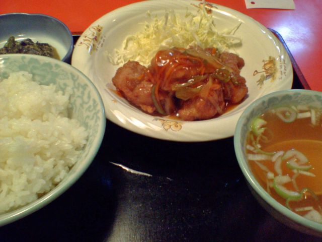 例によって夕飯はM君と一緒に欣欣です。前回M君が食べていたオススメのB「鶏の唐揚げ甘酢あんかけ定食」を頼んでみました。味は可もなく不可もなくというところです。ただ、この組み合わせ(ご飯、唐揚げ、胡麻和え)なら、スープじゃなくて味噌汁が欲しかったな〜。