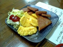 M君、SD君とかりゆしに行ってきました。先日は臨時休業で涙をのみましたが、今日はちゃんと営業中。私はいつものように「フーチャンプル定食」を食べることにしましたが、前々から気になっていた「ポークタマゴ」というのをSD君が頼んでくれました。名前からてっきり豚肉と卵を炒めたようなものかな〜と想像してたんですが全然違いました。SPAMをスライスして焼いたものと卵焼き、サラダのセットというシンプルな料理でした。味はそこそこでしたが、これで600円というのはちょっと高い。