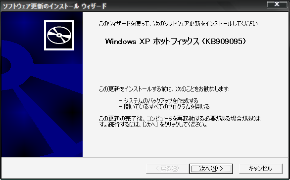 そうして得られたHotFixのファイル(WindowsXP-KB909095-x86-JPN.exe)を適用して再起動。とりあえず無事に起動しました。後はちゃんと休止状態に入れるかどうかしばらく様子を見ることにします。