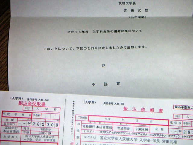 大学の入学料の支払いの免除申請をしてたんですが、結果は見事に不許可でした。予想していたのでショックはありませんが、282,000円という金額には頭がくらくらします。この後は授業料免除の結果もくる予定ですが、おそらくそちらもダメでしょう。
