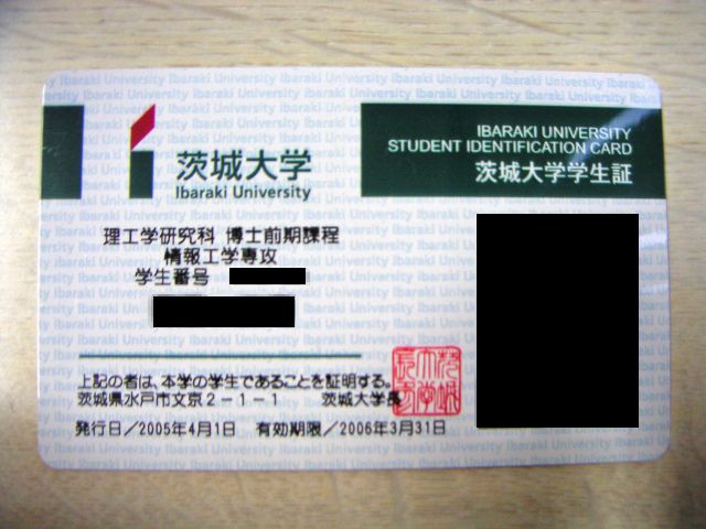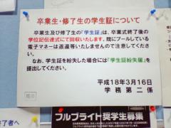 久々に大学の掲示板を見に行ったところ、情報棟の掲示板にこんな貼り紙を発見しました。23日午後の学位記伝達式で学生証を回収するとのこと。へー、学部の時は学生証の扱いなんて何もなかったと思いますが、今は回収するんですね。学生証の裏には一応注意事項として書いてあったんですが、どうせ回収なんてしないだろうと思ってました。
