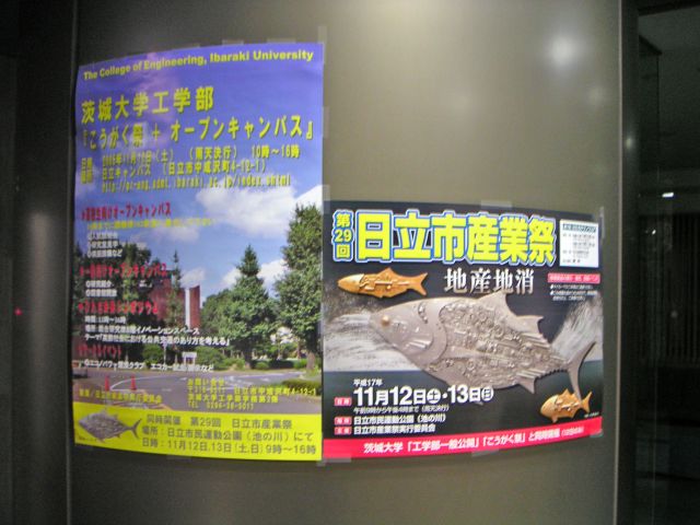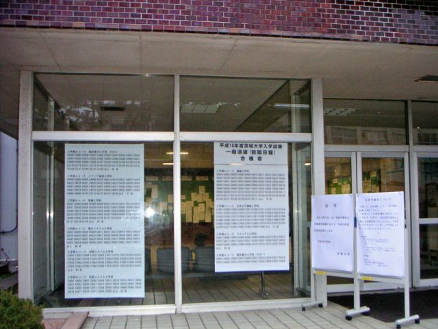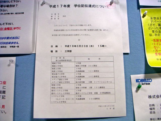 情報棟1Fの掲示板にこんな貼り紙が出ているのに気付きました。「平成17年度 学位記伝達式について」ということで、3月23日の卒業式(学位記授与式及び修了証書授与式)終了後、15時から学位記伝達式が行われるとのこと。場所は情報棟1Fの102講義室です。では、卒業式のスケジュールはというと、10時から水戸の茨城県武道館で執り行われるようです。どちらも例年通りのスケジュールですね。