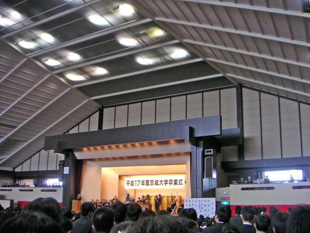 朝方、M君のアパートから自宅に戻り、シャワーを浴びて身支度を調えてから水戸へ出発。水戸キャンパス内の臨時駐車場に車を駐め、卒業式の行われる県武道館へ向かいました。周りのスーツや袴姿の集団を目にすると、2年前の入学式を思い出しますね。あの時は2年間の学生生活に向け、希望に満ちあふれていましたっけ。その後の2年間は希望通りとは言えないこともありましたが、充実したものになったと思います。研究はもちろんのこと、就活、そして研究室で知り合ったM2の仲間達との交流。会社を辞めてまで行った価値はあったかと問われれば、間違いなくあったと答えられます。